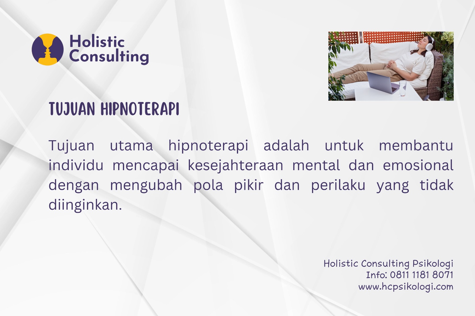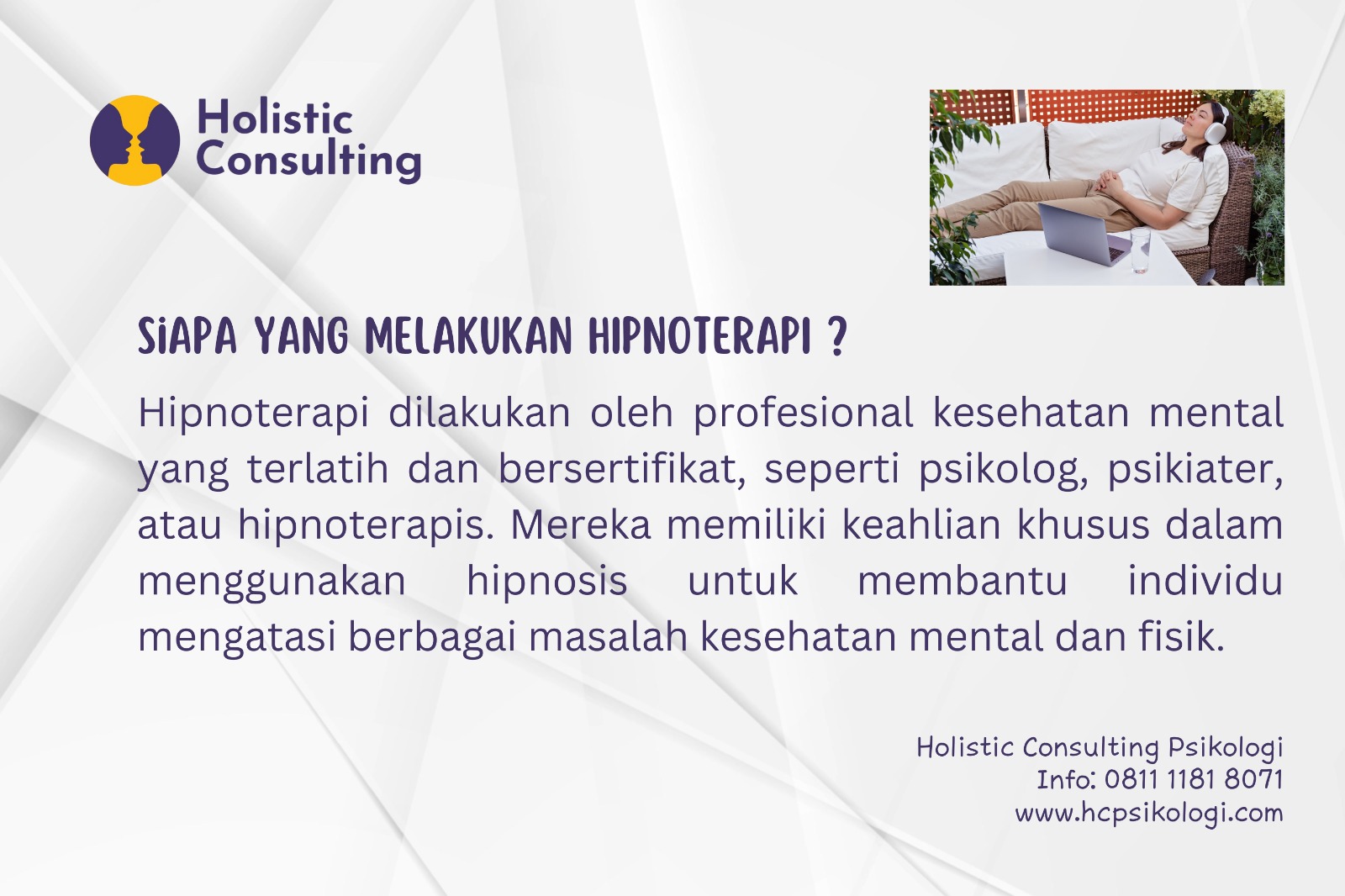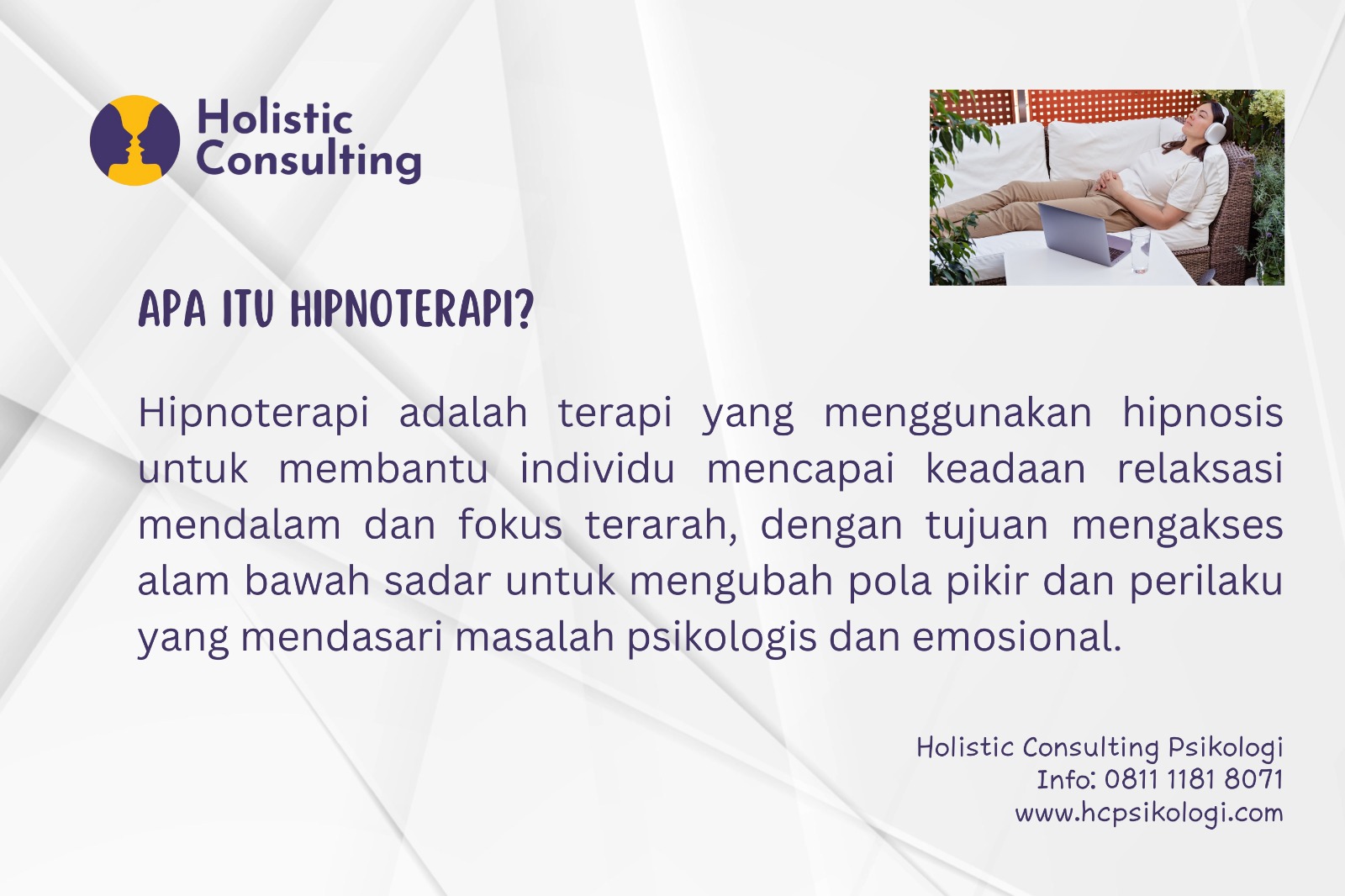 🔓 Bebaskan pikiran dari stres, cemas, dan kebiasaan buruk! 🌿 Hipnoterapi di HolisticConsulting Psikologi Cibubur siap membantu Anda menemukan versi terbaik dari diri sendiri.
